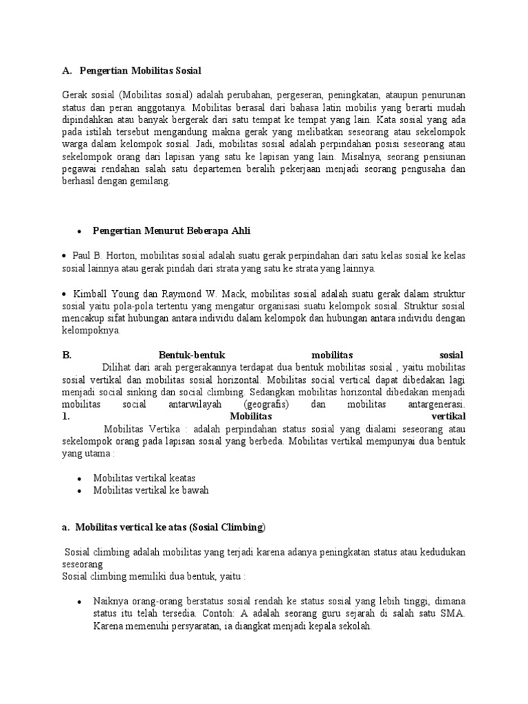 Soerjono Sukanto 1987 mobilitas sosial adalah suatu gerak dalam struktur sosial yaitu pola-pola tertentu yang mengatur organisasi suatu kelompok sosial. Laman Sumber Belajar Kemendikbud. Gerak sosial mobilitas sosial adalah perpindahan status sosial sekelompok orang atau individu ke status yang lain baik secara vertikal maupun horizontal.